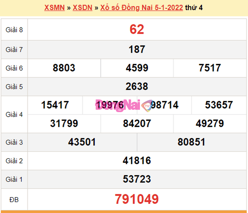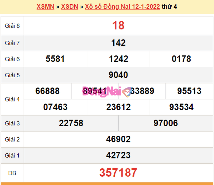 Trực tiếp mở thưởng XSDN thứ 4 hàng tuần vào lúc 16 giờ 15 phút. Tra cứu kết quả xổ số Đồng Nai hôm nay ngày 12/1/2022 nhanh chóng và chính xác qua bảng kết quả SXDN dưới đây.